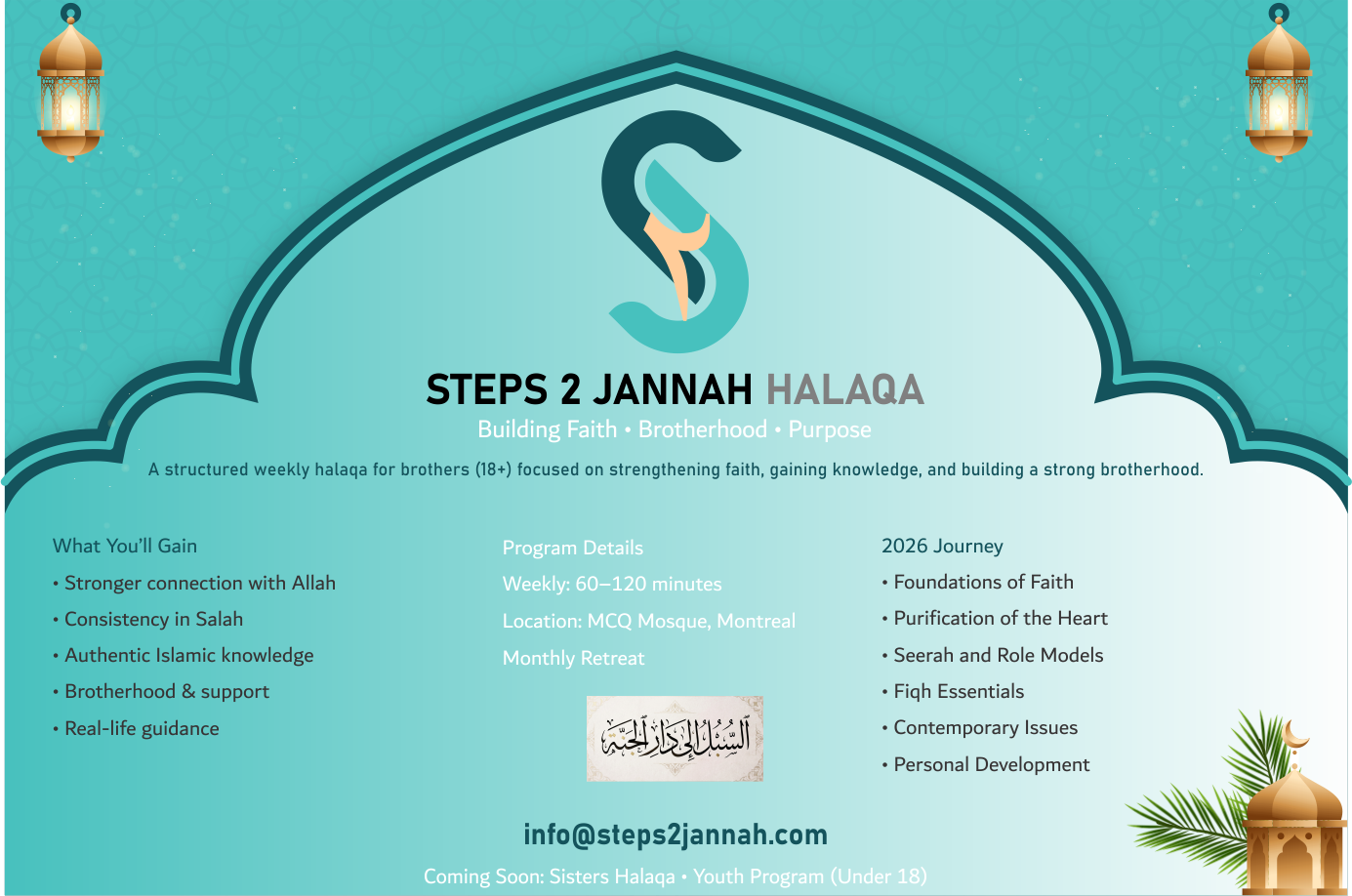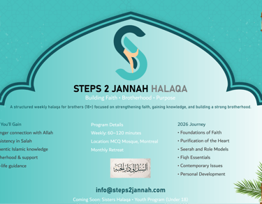 The Steps 2 Jannah Halaqa is an exciting and enriching Islamic learning and personal development program specifically crafted for youth and young adults, right here at MCQ Mosque in Montreal! This dynamic program is dedicated to fostering spiritual growth, deepening brotherhood, and delivering practical Islamic guidance that's firmly rooted in the Qur’an and Sunnah. It empowers participants to confidently navigate the amazing yet challenging realities of modern life with sincerity and enthusiasm!