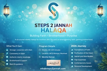 The Steps 2 Jannah Halaqa is an exciting and enriching Islamic learning and personal development program specifically crafted for youth and young adults, right here at MCQ Mosque in Montreal! This dynamic program is dedicated to fostering spiritual growth, deepening brotherhood, and delivering practical Islamic guidance that's firmly rooted in the Qur’an and Sunnah. It empowers participants to confidently navigate the amazing yet challenging realities of modern life with sincerity and enthusiasm!